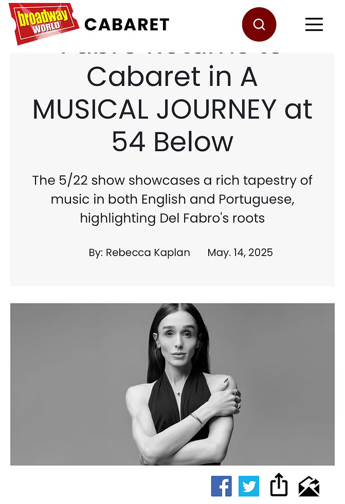🎶✨ Exciting News! I'm thrilled to announce that I'll be returning to the stage in A MUSICAL JOURNEY at 54 Below! ðŸŽðŸŒŸ Join me on 5/22 for a night of beautiful music in English and Portuguese.Darwin Del FabroMay 14, 20251 min readhttps://www.broadwayworld.com/cabaret/article/Interview-Darwin-Del-Fabro-Returns-to-Cabaret-in-A-MUSICAL-JOURNEY-at-54-Below-20250514